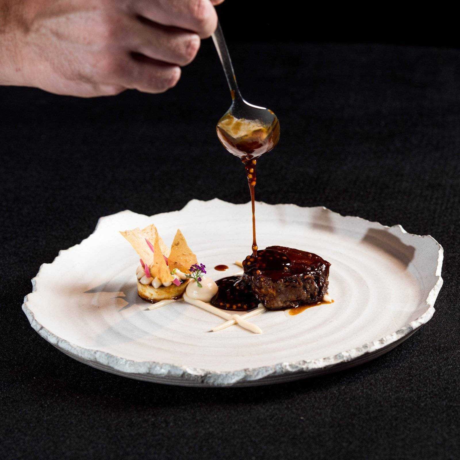Enjoy the hearty flavors of American cuisine with slow-cooked Omaha beef blade, barbecue celeriac, Jerusalem artichoke crisp, and an aromatic jus.